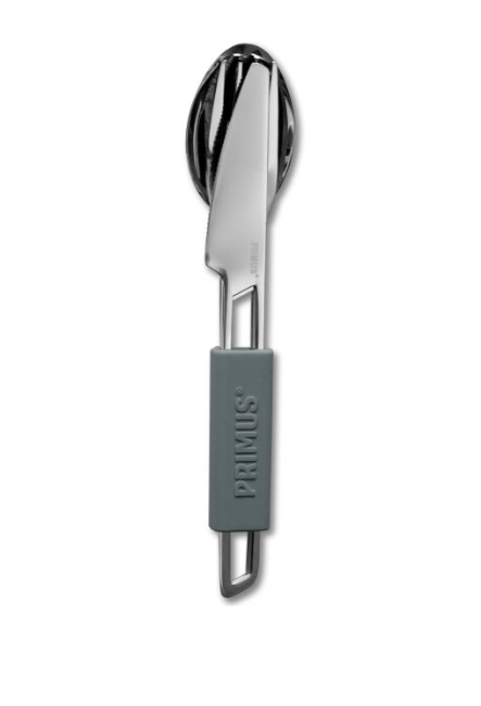 Set bestehend aus einem Löffel, einem Messer und einer Gabel aus hochqualitativem Edelstahl in tollem Design. Weniger Gewicht. Eine Art „Serviettenring“ aus griffigem, hitzebeständigem Silikon hält das Besteck für den Transport zusammen.