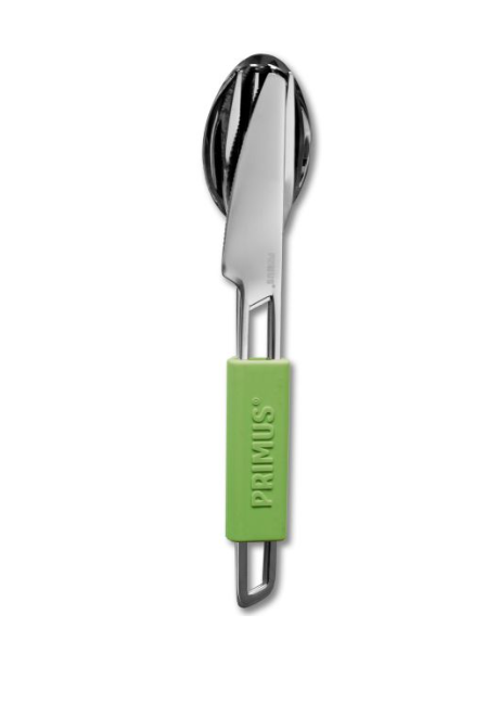 Set bestehend aus einem Löffel, einem Messer und einer Gabel aus hochqualitativem Edelstahl in tollem Design. Weniger Gewicht. Eine Art „Serviettenring“ aus griffigem, hitzebeständigem Silikon hält das Besteck für den Transport zusammen.