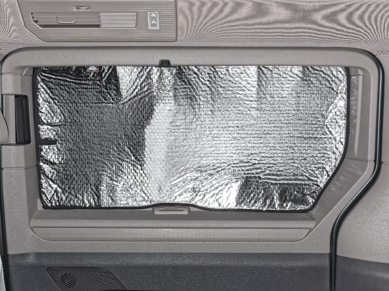 ISOLITE ® Inside für Schiebefenster in Schiebetür rechts der VW T7 California Ocean/Coast, Beach Tour/Camper ist einteilig und wird mit Klettverschluss befestigt. Das Verdunkelungsrollo lässt sich weiterhin verwenden und über die ISOLITE ® Inside herunterziehen und unten festmachen.