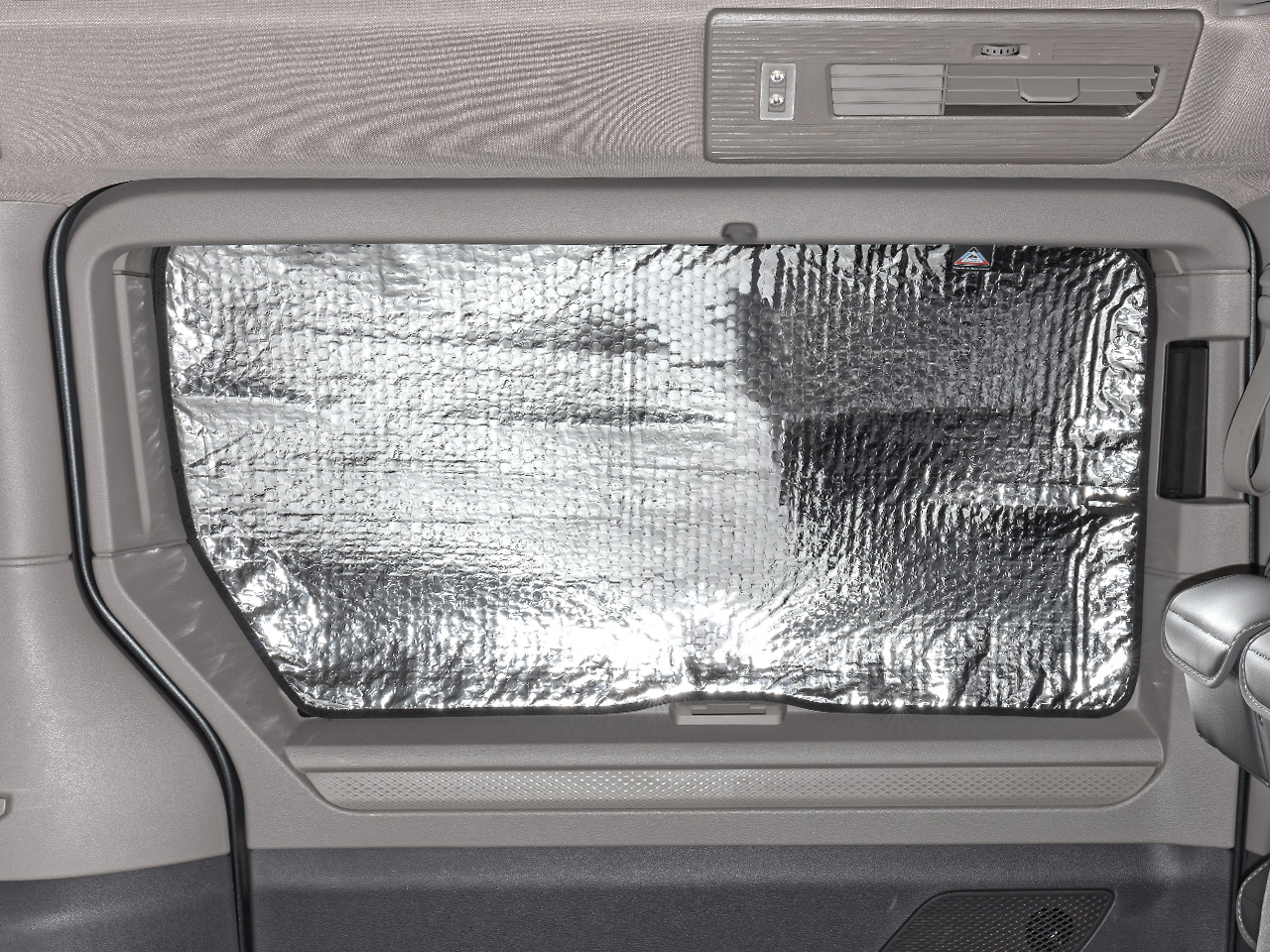 ISOLITE ® Inside für Schiebefenster in Schiebetür links, VW T7 California Ocean/Coast, Beach Tour/Camper ist einteilig und wird mit Klettverschluss befestigt. Das Verdunkelungsrollo lässt sich weiterhin verwenden und über die ISOLITE ® Inside herunterziehen und unten festmachen.